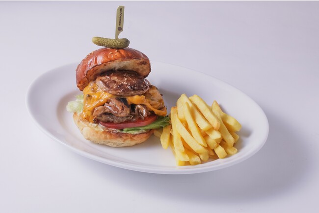 パテの上に霜降りひらたけ、マイタケ、ブナシメジのバルサミコマリネとチーズをのせ、一番採り生どんこの姿マリネを贅沢に使った迫力もボリュームも満点のグリルバーガーです。
