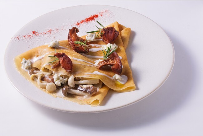 たっぷりのキノコと自家製鶏ハムのプロヴァンス風マリネを包み混んだ焼きたてのクレープ。風味豊かなゴルゴンゾーラチーズをアクセントに。