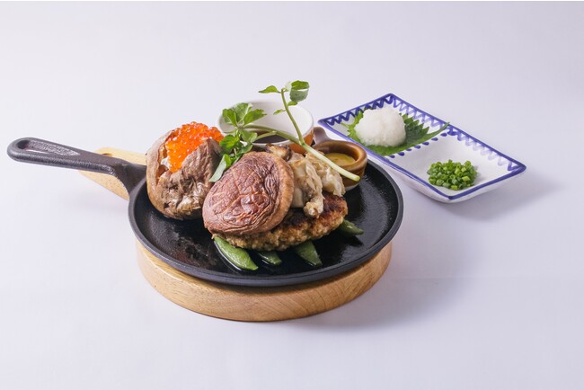 肉厚で大きな一番採りどんこなど旬のキノコをたっぷりと使用した和風ハンブルグステーキです。付け合わせのベイクドポテトにはいくらをのせました。