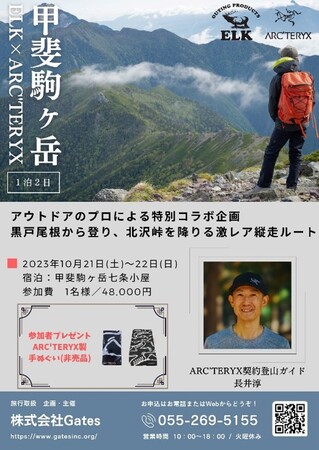 山梨県甲府市で創業40年以上の老舗アウトドアショップ「ELK」(エルク)を母体とするアウトドア専門の旅行会社、株式会社GATES(所在地:山梨県甲府市、代表取締役社長:柳澤隆広)は、革新的な高機能アウトドア製品を取り扱うカナダ、バンクーバー発祥のアウトドアブランド「ARC’TERYX」(アークテリクス)の日本国内での輸入、販売を行うアメアスポーツジャパン株式会社(所在地:東京都新宿区、代表取締役社長:Sean Hillier)とコラボレーションした南アルプスの名峰であり山梨百名山の一座、甲斐駒ヶ岳(標高:2,967m)登山ツアー「ELK x ARC’TERYX 甲斐駒ヶ岳ツアー」を2023年10月21日(土)~22日(日)1泊2日で企画・実施し、本日から登山ツアー参加者を募集いたします。