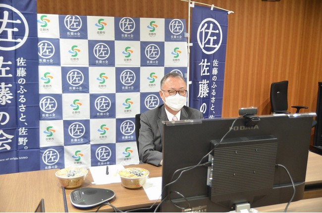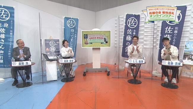 オンラインツアーの拠点となるスタジオには、佐藤の会おなじみのコメンテーター姓氏研究家の森岡浩さんを迎え、念願の佐藤の会初登場となった元プロ野球選手のG.G.佐藤さん、大田原市出身でNHK Eテレ(教育テレビ)の番組でおなじみの俳優・声優の佐藤貴史さん、そして進行はアナウンサーの佐藤美樹さんが出演。出演者の自己紹介終了後、金子市長から出演者・参加者に向けて「今回は、オンラインでの開催となりますが、佐野市の名所を巡りながらのご当地グルメ紹介、そして、佐藤の会と企業とのコラボの様子など、様々な企画をお届けしますので楽しんでいただければと思います。」とお言葉をいただき、ツアーがスタートしました。