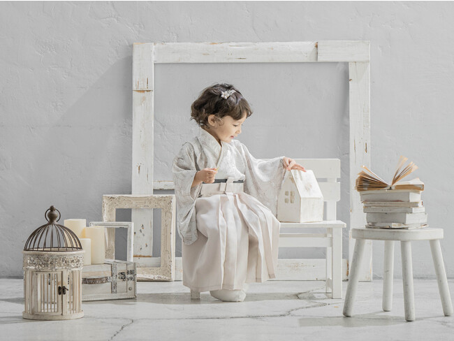 新色のグレージュ色の袴を合わせ、優しく可愛らしい雰囲気の一着です。