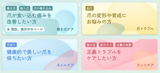 こうした背景を踏まえ、巻き爪研究所では「来店前に、自分の悩みがどのケアに該当するのかを把握できる」ことを目的に、店舗ページを以下の4カテゴリに分けて情報提供を行っています。