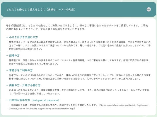 また、どなたでも安心して通える環境づくりの一環として、各店舗ページでは以下のような多様なニーズへの対応可否を明示しています。