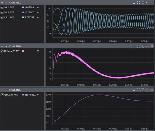 モーターモデルの各端子を出力変数として指定することで、三相入力電流、積算回転角度、トルク波形、回転速度を確認、モーター駆動時の波形をシミュレーションすることがます。