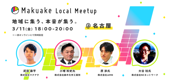 2022年3月11日(金)に開催予定の「Makuake Local Meetup@名古屋」にAMNが参加いたします。本イベントの第1部では、弊社代表の原を含め、ADV2020に参加いただいた鈴木化学工業所代表小幡氏、Makuake名古屋責任者武田氏、NCネットワーク名古屋代表大谷氏が、「製造業から、いかに自社商品のアイデアを生み、実行していくか」についてトークセッションを行います。第2部では「商品アイデア創出」をテーマにワークショップを開催予定です。「自社の技術を生かした新商品開発に興味がある!」「Makuakeを活用してみたい!」という方はぜひご参加下さい。