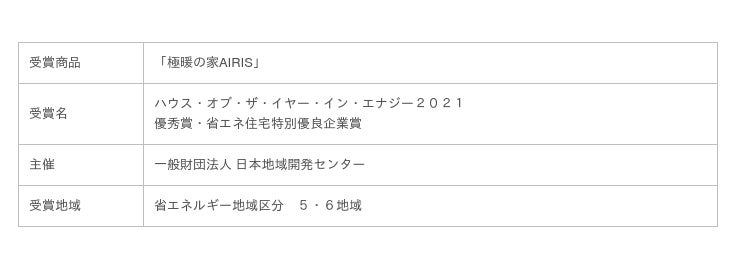 極暖の家AIRISは先進の技術や設備を導入した”高断熱・高気密の住まい”と環境性能が評価され、ハウス・オブ・ザ・イヤー・イン・エナジー2021「優秀賞」を受賞しました。