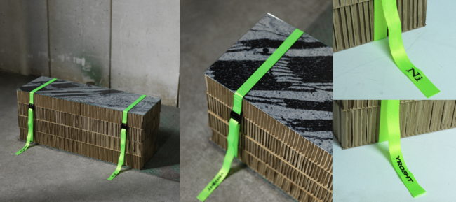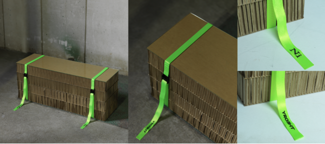 Niは、輸送される荷物が最終梱包された状態=「荷姿」から着想したインテリアオブジェクトです。「荷姿」の凛とした佇まいや、受け手に届いた後に解体されてしまう儚さからインスピレーションを得ました。ベンチやテーブルとして使用することが可能です。
