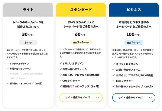 本サービスは、「何から始めればいいか分からない」「エンジニアがいないのでサイト更新ができない」などの悩みを持つ中小企業のご担当者向けに、限られた予算・人手・時間の中でも、実用性とデザイン性を両立したWebサイトを制作・リニューアルできるサービスです。ノーコードツール「Studio」を活用することにより、スピーディかつリーズナブルなサイト構築を実現します。