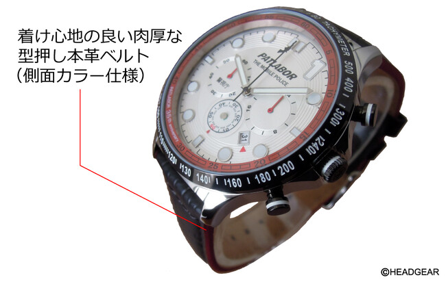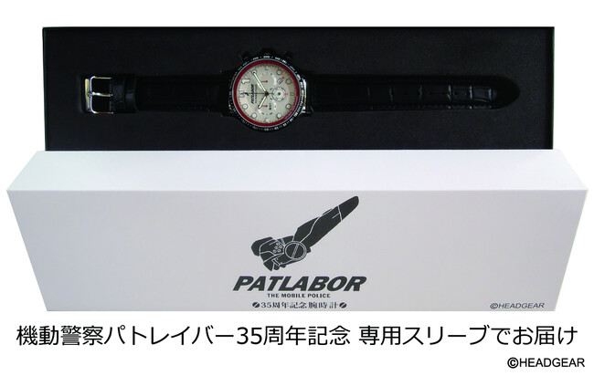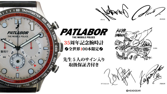 機動警察パトレイバー35周年記念腕時計 高田明美先生に監修していただいた機動警察パトレイバー35周年記念腕時計。 腕時計のカラーリングはブラック、ホワイト、レッドでイングラムをイメージした配色。 AV1号機の証として1時位置のみ「1」のビッグアラビアインデックスを採用し、6連式リボルバーカノンをイメージしたクロノグラフ60秒計針、警視庁の文字が入った60分計、警察のマーク桜の代紋入りリューズなど、35周年記念に相応しいデザインのスポーツタイプウォッチ。