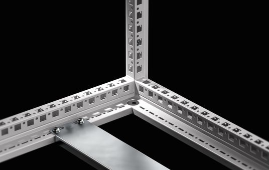 VX25エンクロージャーシステムはフレーム構造を採用した筐体です。このフレームが大きな特長で、盤製造にさまざまなメリットをもたらします。フレームに開口された25mmピッチ穴により、システムセクション(レール)やアクセサリーの配置を自由に行うことができ、スペースの有効活用を実現します。また、対称的なフレームは、すべての側面からのアクセスを可能にし、外側からのアクセサリーの取り付けもスムーズに行えます。また、本体フレームとサイドパネルやベースなどを組み合わせて使用するモジュール構造になっているので、機器実装や配線作業時間を大幅に短縮可能です。