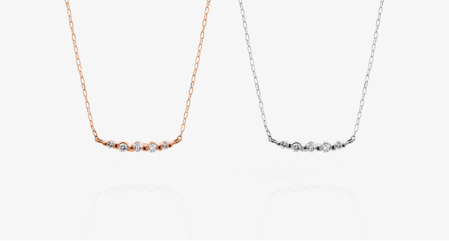 デコルテを美しくみせる優しいラインに輝くダイヤモンドが、肌にすっと溶け込むようなネックレス。毎日身に着けられるお守りのようなジュエリーです。一粒ダイヤモンドネックレスと組み合わせるなど多様なバリエーションが楽しめ、上質な輝きが女性らしいエレガントな胸元を演出します。