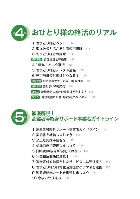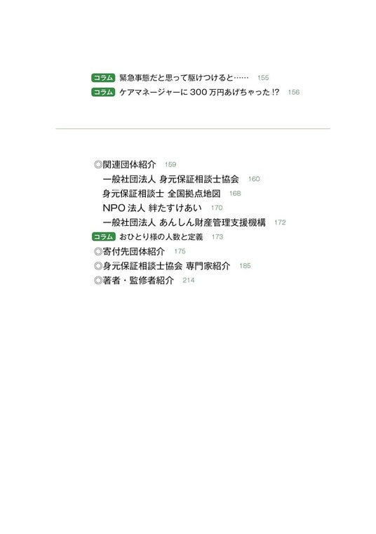 特に、 入院・施設入居時の身元保証人問題 認知症・急病時の緊急対応 死亡後の遺体搬送、葬儀・供養、遺品整理 信頼できる寄付先の選定や契約の注意点といった、実務的な問題に直面したときの具体的な対応を、図解やチェックリストとともに紹介。巻末には、身元保証に対応する団体情報、信頼できる専門家や相談先も収録し、実用的なガイドブックとして構成されています。