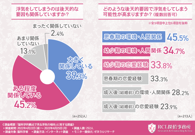 RCL探偵事務所を運営する株式会社RCLは、脳科学者を対象に、「脳科学的観点で見る浮気の傾向」に関する調査を実施しました。