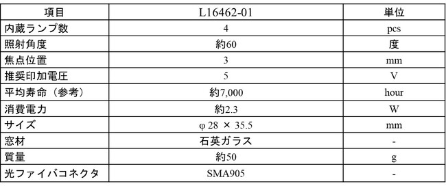 本製品は、波長2500nmまでの近赤外光を出力する4つのランプを内蔵した、近赤外光を利用するリアルタイム成分分析装置向けの光源です。中心に光ファイバを接続することで、光を試料に照射するとともに微弱な拡散反射光を高い効率で集光し、分光器に導光することができます。