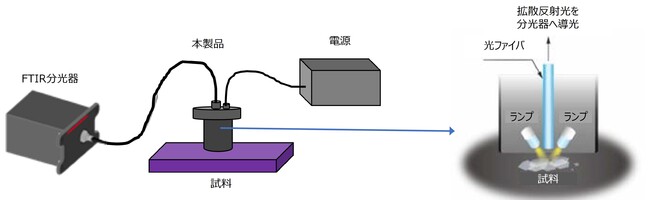 ランプを試料に近接させ直接照射することで、光ファイバによる吸収を減らし光の利用効率を高めることができますが、ランプの光が拡散反射光に混ざり迷光(※3)が生じるため正確な測定ができません。今回、ランプの個数や位置、照射角度などを一から設計するとともに光源の構造を工夫することで、ランプを試料に近接させながらも迷光の発生を抑える拡散反射光源の開発に成功しました。また、試料からの微弱な拡散反射光を高い効率で集光することができる構造としています。