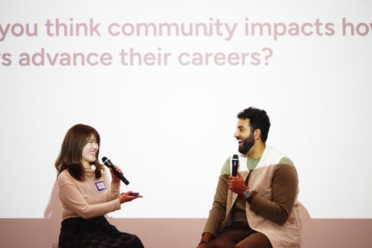 Framer B.V. のMohammad Khan氏(右)と Creative Tokyo創業者兼株式会社SKYDEA代表取締役 安孫子仁美氏(左)によるファイヤーサイドチャット。(撮影:Ed Thompson、Concept Design I/O代表)