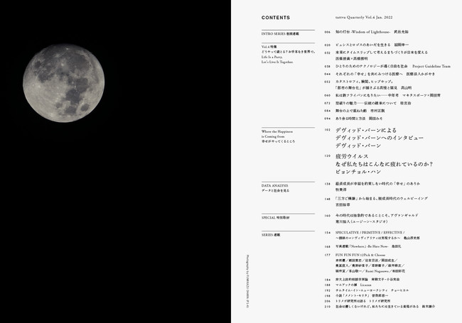 大ヒット映画アメリカンユートピアの脚本を手がけたデヴィッド・バーン氏のセルフインタビューや、哲学者・ビョンチョル・ハン氏インタビュー、さらには市村正親氏インタビュー、日本型ウェルビーイングについて測定したWell-Being Reportの解説など、今回も様々な方々が、テーマに関連した多様な視点をお届けします。さらに、デヴィッド・バーン氏の企画ページにある線画は、バーン氏ご本人によるものです。