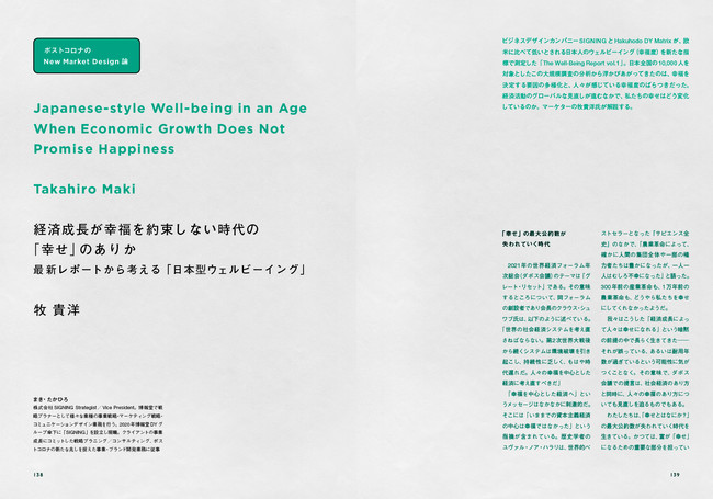 ビジネスデザインカンパニーSIGNINGとHakuhodo DY Matrixが、欧米に比べて低いとされる日本人のウェルビーイング(幸福度)を新たな指標で測定した「The Well-Being Report vol.1」。日本全国の10,000人を対象としたこの大規模調査の分析から浮かびあがってきたのは、幸福を決定する要因の多様化と、人々が感じている幸福度のばらつきだった。経済活動のグローバルな見直しが進むなかで、私たちの幸せはどう変化しているのか。マーケターの牧貴洋氏が解説する。