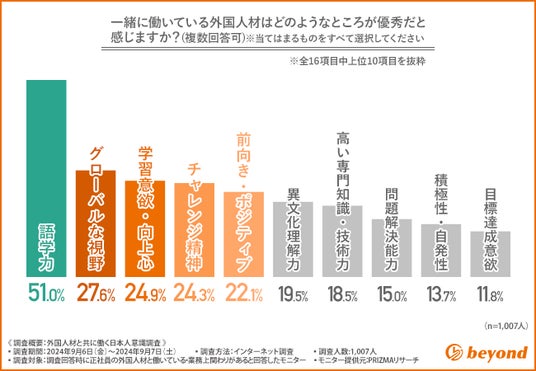 続いて、「一緒に働いている外国人材はどのようなところが優秀だと感じますか?(複数回答可)※当てはまるものをすべて選択してください」と質問したところ、『語学力(51.0%)』と回答した方が最も多く、次いで『グローバルな視野(27.6%)』『学習意欲・向上心(24.9%)』『チャレンジ精神(24.3%)』『前向き・ポジティブ(22.1%)』となりました。