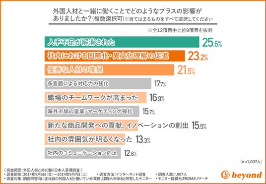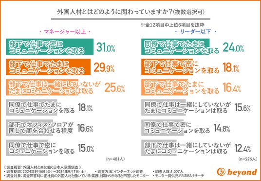 beyond global Japan株式会社(本社所在地:東京都千代田区、beyond global group President & CEO:森田 英一)は、正社員の外国人材と働いている・業務上関わりがある方を対象に、外国人材と共に働く日本人意識調査を実施しました。