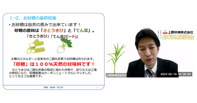 1回目のオンライン勉強会は2月10日(木)に実施し、昨今ネガティブなイメージが多い「お砂糖」に関して、サトウキビやてん菜を原料とした「100%天然の甘味料」であることをはじめ、当社製品の「焚黒糖(たきこくとう)(加工黒糖)」「きび糖」などの健康面や料理に使用した場合の優位性に関して説明。また、原料として使用している「沖縄黒糖」は沖縄の重要な産業であること、黒糖製造過程では加熱原料としてもサトウキビのカスを使うことで、二酸化炭素が新たに発生しないカーボンニュートラルを実現しているという社会的な役割に関しても説明致しました。