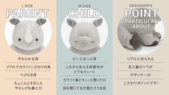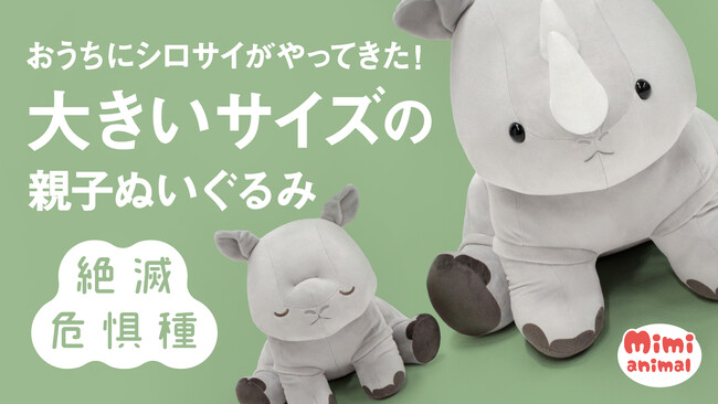 リアルだけど可愛い、インテリアにもマッチする大きいサイズのシロサイ親子のぬいぐるみです。