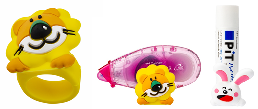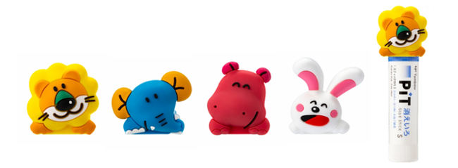 「たべっ子どうぶつ着せかえリング」はさわっておだ やかな弾力としっとり感のあるシリコーン製。スティ ックのり「ピット S」のボディに通してぴったりフィット。のりが転がりにくい、倒れにくい、キャップに 付けると開けやすい、マイマークになる、などスティ ックのりが使いやすくなります。また、テープのり「ピ ットエアーミニつめ替えタイプ」にはかわいいデスク スタンドになります。