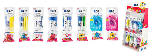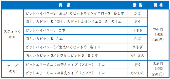 おまけ付の対象はスティックのり「ピット S」4 種とテープのり「ピットエアーミニつめ替えタイプ」です。