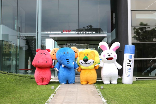 「たべっ子どうぶつ着せかえリング」 おまけ付ピットの発売を記念して、 たべっ子どうぶつのキャラクターが トンボ鉛筆本社を訪問しました。社員と名刺交換して会議室で企画ミーティングをしました。その後、正面で記念 撮影、ビッグなピットスティックのりも飛び入り。本社前庭の芝生の上でわいわい遊んで交流を深めました。
