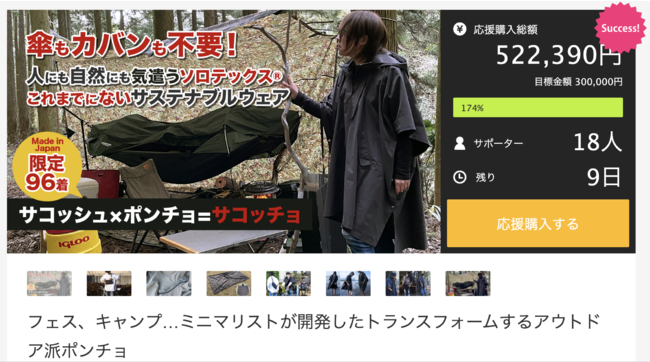 また、第2弾は、トランスフォームするアウトドアポンチョ「サコッチョ」の販売をMakuakeにて販売スタートし、わずか12時間で目標達成しました。(詳細はこちら:https://bit.ly/3tK2Vke)