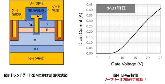 MOSFETにおいて、プロセスの最適化や独自のMOS界面制御技術を適用することで、トレンチゲート型MOSFETのノーマリーオフ動作の実証に成功いたしました(図3・図4)。こちらも新規P型半導体 α-(IrGa)2O₃ の材料ポテンシャルを最大限活用して製品化に向けた開発を進めて参ります。