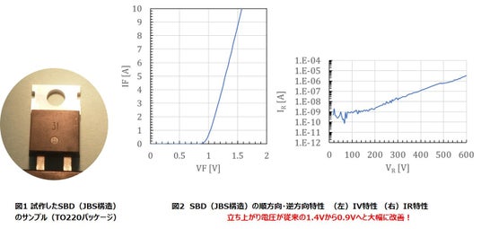 次世代SBDとして、JBS構造の600V・10A品の試作に成功いたしました(図1)。これにより、立ち上がり電圧が従来の1.4Vから0.9Vへと大幅に改善され、高効率化が期待できます(図2)。この試作では、世界初のP型半導体材料であるα-(IrGa)2O₃を使用しており、酸化ガリウムの高い材料ポテンシャルを生かすうえで、極めて重要な成果と位置付けています。2025年以降、サンプル出荷を開始し、市場投入を目指してまいります。