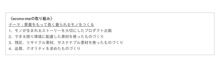 衣類が大量に破棄される主な要因を、流行のサイクルの加速化/低品質な商品の大量生産と考え、愛着を持って使い続けてもらえることを念頭においたコンセプト策定、それに基づいたプロダクトの企画、環境に配慮した素材を使用したプロダクト製作を行うことで、衣類大量廃棄の要因と根本的に向き合い、最終的に「衣類の大量廃棄」を軽減できるような取り組みを続けています。