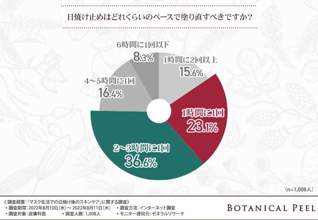 「日焼け止めはどれくらいのペースで塗り直すべきですか?」と質問したところ、『2~3時間に1回(36.6%)』と回答した方が最も多く、次いで『1時間に1回(23.1%)』『4~5時間に1回(16.4%)』と続きました。