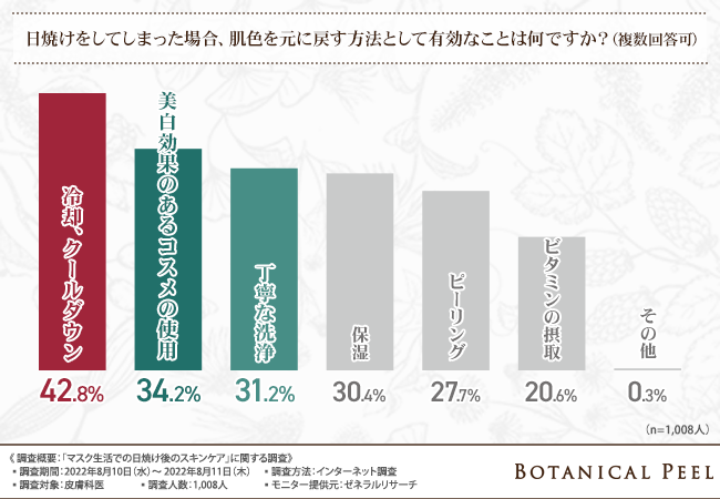そこで、「日焼けをしてしまった場合、肌色を元に戻す方法として有効なことは何ですか?(複数回答可)」と質問したところ、『冷却、クールダウン(42.8%)』と回答した方が最も多く、次いで『美白効果のあるコスメの使用(34.2%)』『丁寧な洗浄(31.2%)』と続きました。