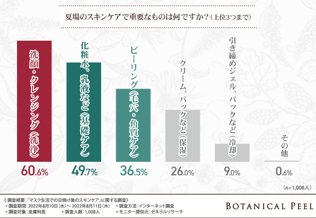 「夏場のスキンケアで重要なものは何ですか?(上位3つまで)」と質問したところ、『洗顔・クレンジング(洗浄)(60.6%)』と回答した方が最も多く、次いで『化粧水、乳液など(基礎ケア)(49.7%)』『ピーリング(毛穴・角質ケア)(36.5%)』と続きました。