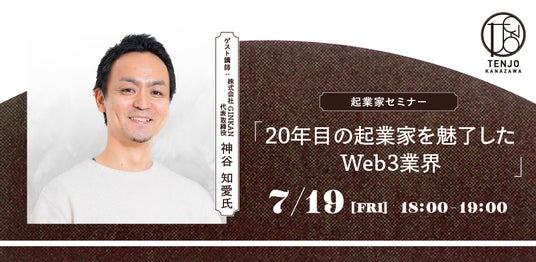 一般社団法人CLL(石川県金沢市 代表:宮田 人司)が、金沢未来のまち創造館で展開する起業支援事業 TENJO KANAZAWAは、2024年7月19日(金)にオンラインセミナー「20年目の起業家を魅了したWeb3業界」を開催します。Web3プロジェクト「SyFu」が話題の株式会社GINKANの代表取締役 神谷知愛氏をゲストスピーカーに迎え、20年間にわたる起業家としての経験や現在取り組んでいる最先端のWeb3業界について伺います。(申込先:https://tenjo-entrepreneur-seminar-20240719.peatix.com)