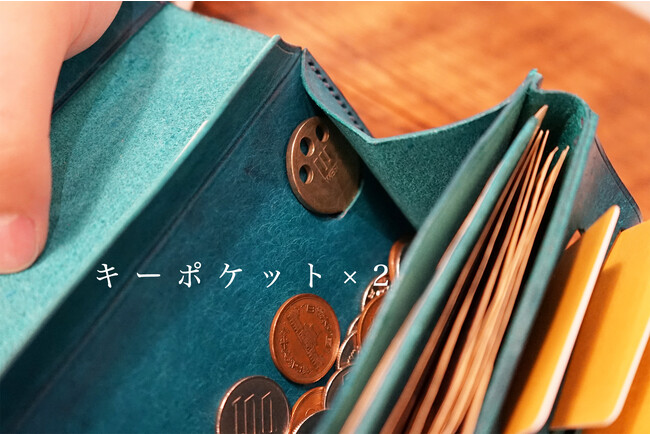 小銭スペースに左右で計2個のキーポケットを備えています。左右の端に配置しているので、小銭を出す時に邪魔になりません。