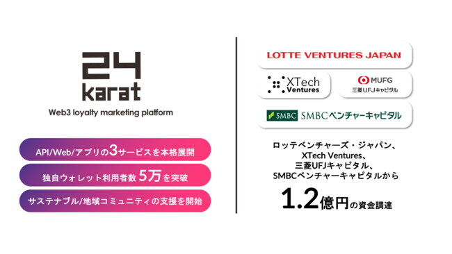 24karat 株式会社(本社:東京都渋谷区、代表取締役:小川真輝、セスルアン、以下24karat)はロッテベンチャーズ・ジャパン、XTech Ventures、三菱UFJキャピタル、SMBCベンチャーキャピタルを引受先とするプレシリーズAラウンドにて1.2億円の第三者割当増資を完了しました。今回の調達により、累計調達金額は1.8億円となります。今回調達した資金は主にプラットフォーム強化、ビジネス拡大に向けた人材採用、マーケティング活動に活用します。