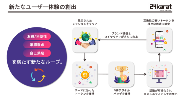 24karatは、Web3の持つ流動性や拡張性を活用して利便性を高めるとともに、承認欲求や自己満足といったロイヤルユーザーが抱える根源的なニーズがコミュニティによって楽しく継続的に満たされるループを構築し、ブランドとユーザーの強い繋がりを提案します。