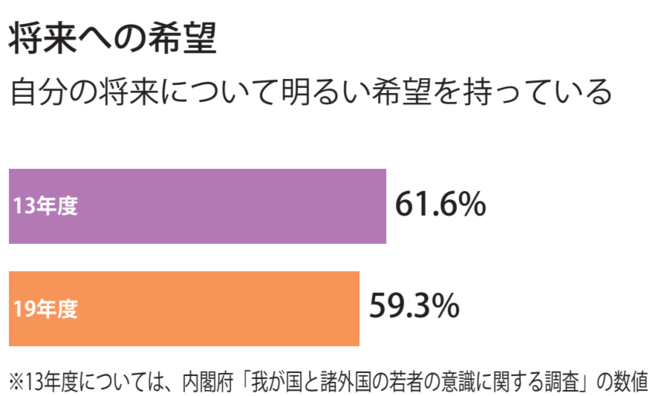 内閣府の調査によると、子ども・若者「自分の将来について明るい希望を持っている」と回答した子ども・若者は59.3%となり、過去の調査と比べて数値は下降しています。