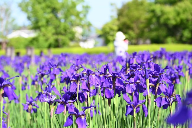 早水公園で約2万8千株、約42万本のアヤメが見頃を迎え、公園が鮮やか紫色に染まっています。