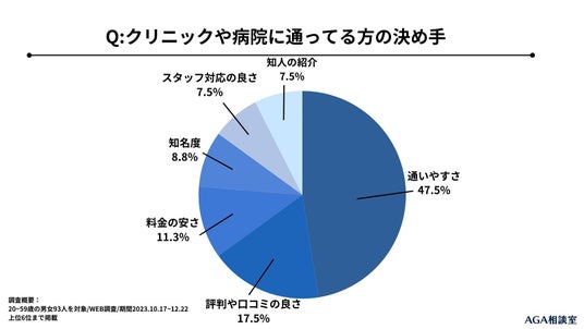 AGAクリニックや病院の決め手では評判や口コミよりも「通いやすさ」が47.5%と「評判がいい」の17.5%を上回る結果となりました。