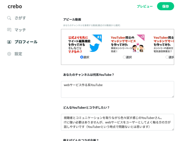 ユーザーは「どんなYouTuberとコラボしたいか?」「撮影方法」「いつ頃コラボしたいか?」などの条件を入力するだけでcrebo上にプロフィールページを作成することができます。