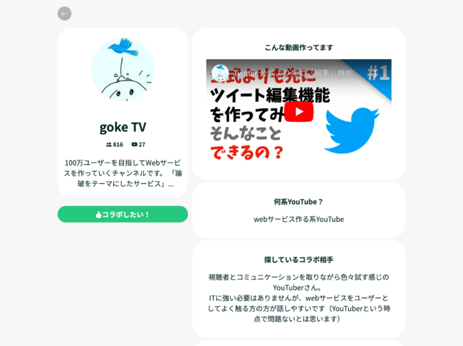 作成したプロフィールページはcrebo上で公開することができ、双方で「コラボしたい!」ボタンを押すことでマッチが成立すると、YouTuber間でメッセージのやり取りができるようになります。なお、プロフィールページをcrebo上で公開することができるのはチャンネル登録者数が800以上のチャンネルのみです(登録やプロフィールページの作成はチャンネル登録数800未満でも可能)。