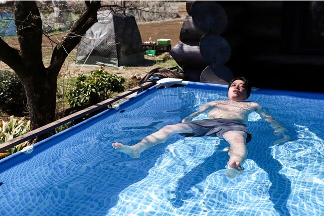 ログハウス前に設置されたプールで水風呂体験