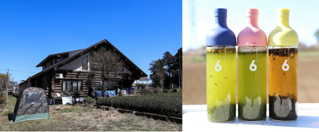 おづつみ園の茶畑横に設置したテントサウナ(写真左) とロウリュウに使用した玄米茶、緑茶、ほうじ茶(写真右)