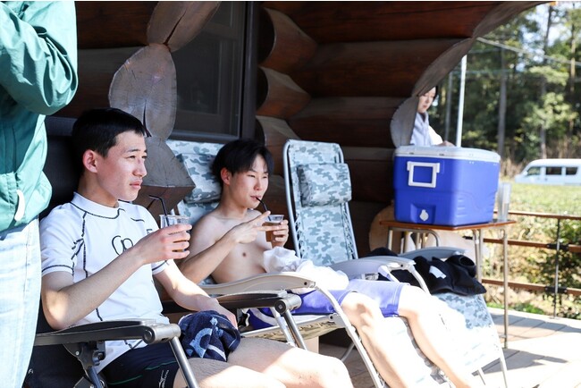 ログハウスでドリンクを飲みながら整う参加者の方々