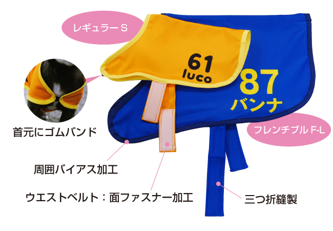 昨年4月に「競馬風ミニゼッケン」を発売しましたが、サイズが大、小の2サイズだけということもあり、お客様から「他のサイズはありませんか?」という問い合わせをいただいておりました。また、胴回りに巻くタイプだったので、サイズぴったりに作らないと、ズレてしまうこともありました。せっかく好評をいただいている商品なので、しっかりしたものでご提供したい!という思いから、今回、サイズラインナップを増やし、着せやすく調整も出来るように大幅リニューアルをしました。